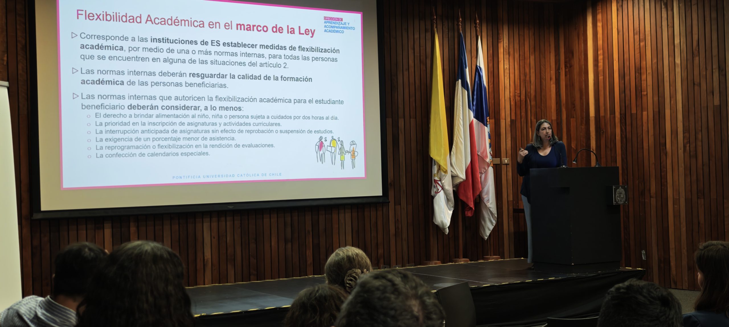 En una nueva jornada de trabajo con directivos y directivas docentes de la Pontificia Universidad Católica de Chile, liderada por el vicerrector académico, Mario Ponce, la directora de Aprendizaje y Acompañamiento Académico, Catalina García, presentó los principales lineamientos de la Ley 21.790 “Yo Cuido, Yo Estudio”, junto con su implementación institucional y los desafíos asociados a su aplicación en la UC.