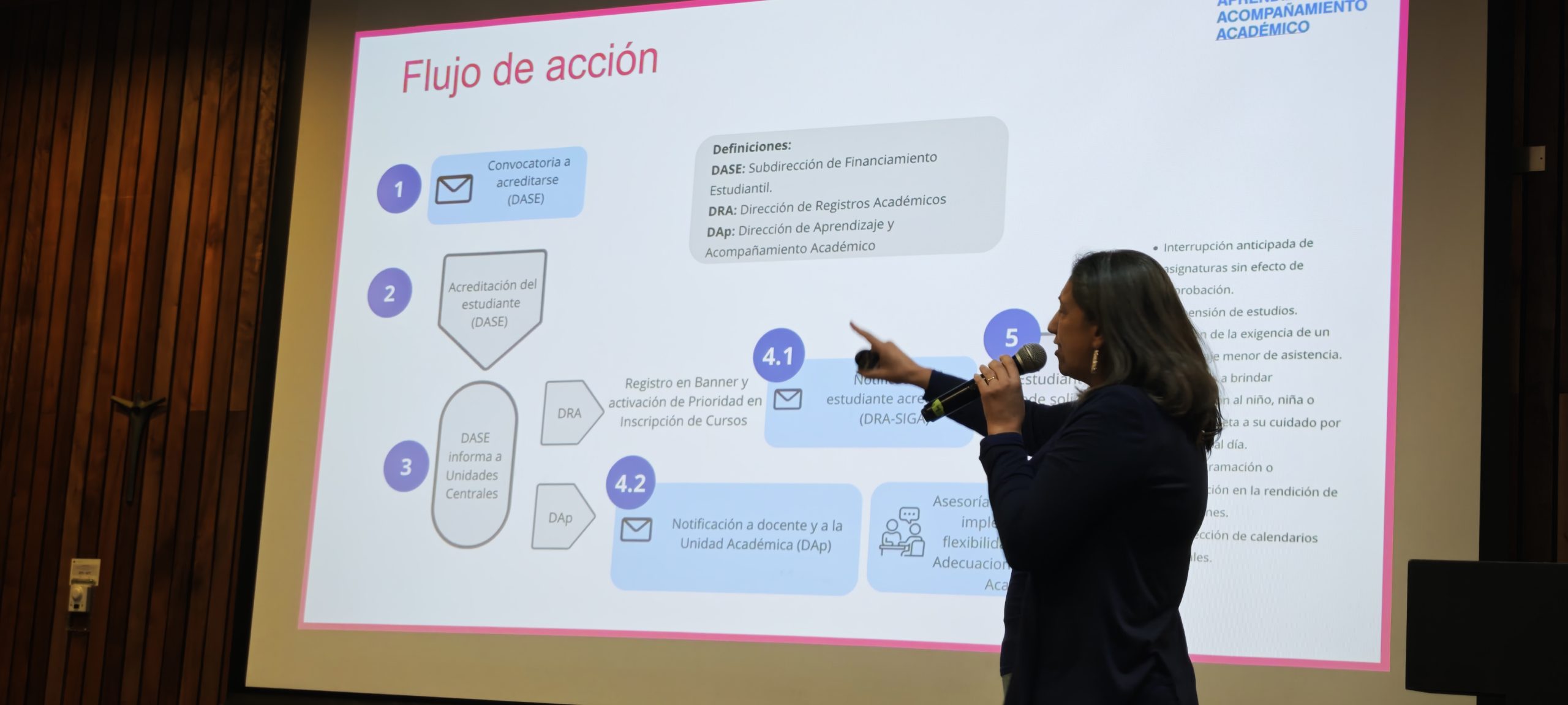 La presentación también permitió distinguir entre flexibilidad académica y adecuaciones, siendo estas últimas ajustes más permanentes, generalmente vinculados a situaciones como discapacidad, que buscan asegurar condiciones de acceso equitativas al proceso formativo.