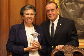 “A través de este acuerdo plasmamos nuestra alegría y compromiso con este proyecto, que ha sido un gran aprendizaje para nosotros como institución y no me cabe duda de que esta iniciativa va a seguir creciendo», dijo el rector Sánchez, quien le entregó el Cristo distintivo de la UC a la Hermana Nelly en reconocimiento a su labor y compromiso con la causa.